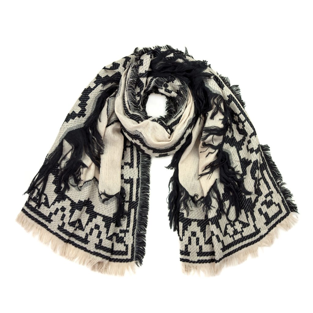 Zimní šála s geometrickými motivy. Velmi dlouhá, ideální k zabalení se. Teplá a příjemná. Hodí se k mnoha různým stylizacím - zároveň elegantním i městským. Ideální doplněk pro ženy, které mají v oblibě originální šály. Velikost: Univerzální dámské