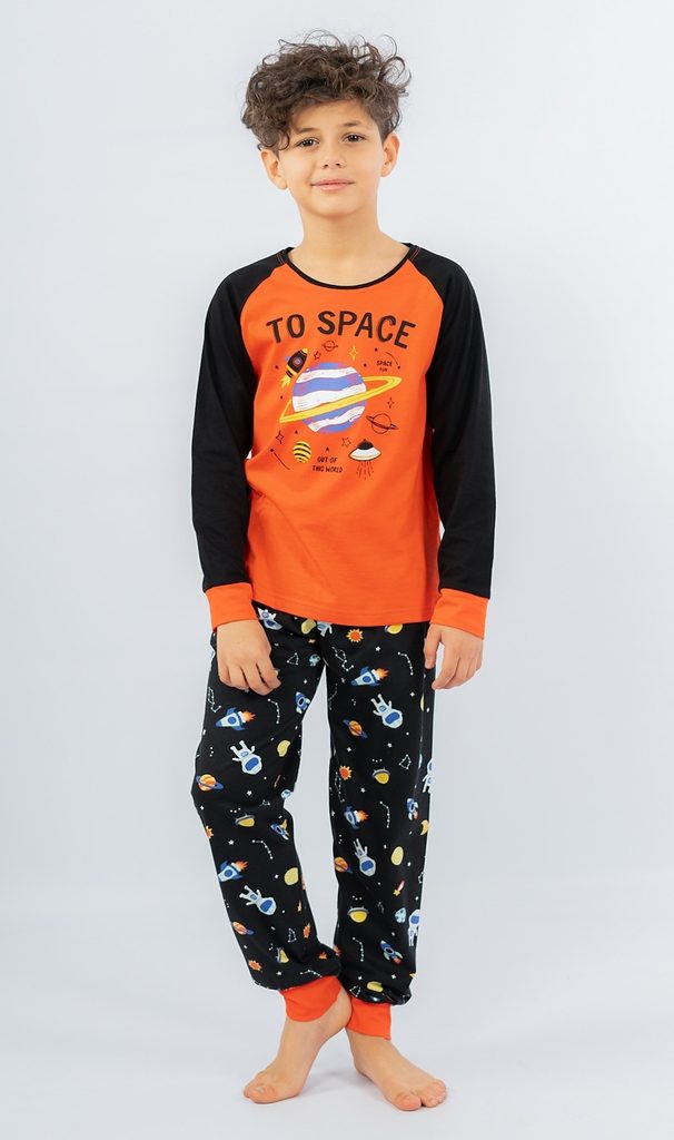Dětské pyžamo dlouhé Vesmír. Dětské pyžamo se skládá z trička s dlouhým rukávem a dlouhých kalhot. Na tričku je obrázek vesmírného světa s nápisem Out of this World-To Space.Rukávy jsou pohledově barevně odlišené, elastické panty rukávů jsou pak ve stejné barvě jako zbytek trička. Dlouhé kalhoty jsou také potištěny vesmírnými motivy a jsou zakončeny elastickými panty. Použitý materiál je jemný a poddajný na dotek. Pyžamo je vhodné i na denní nošení.