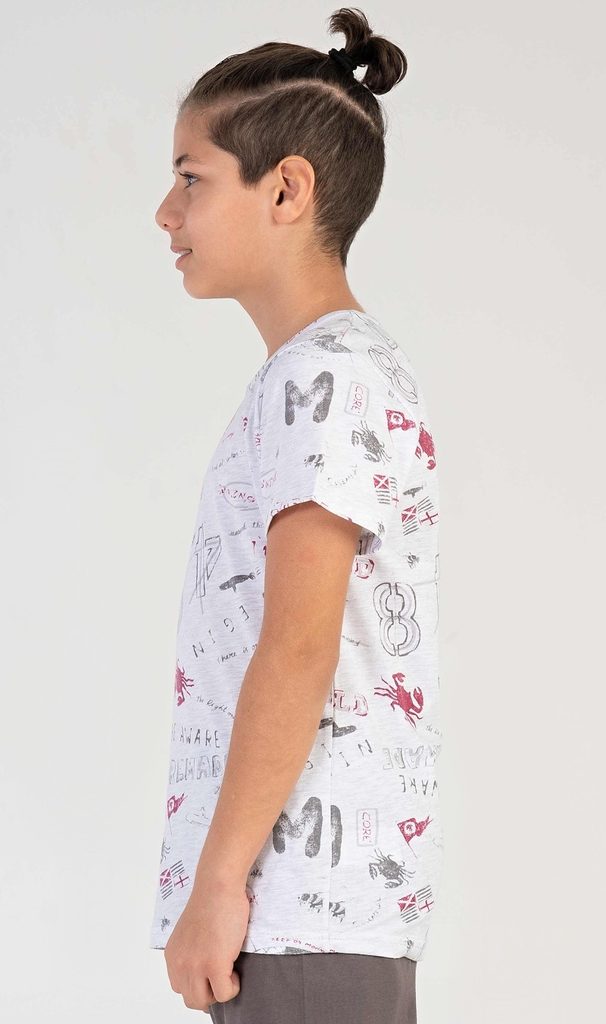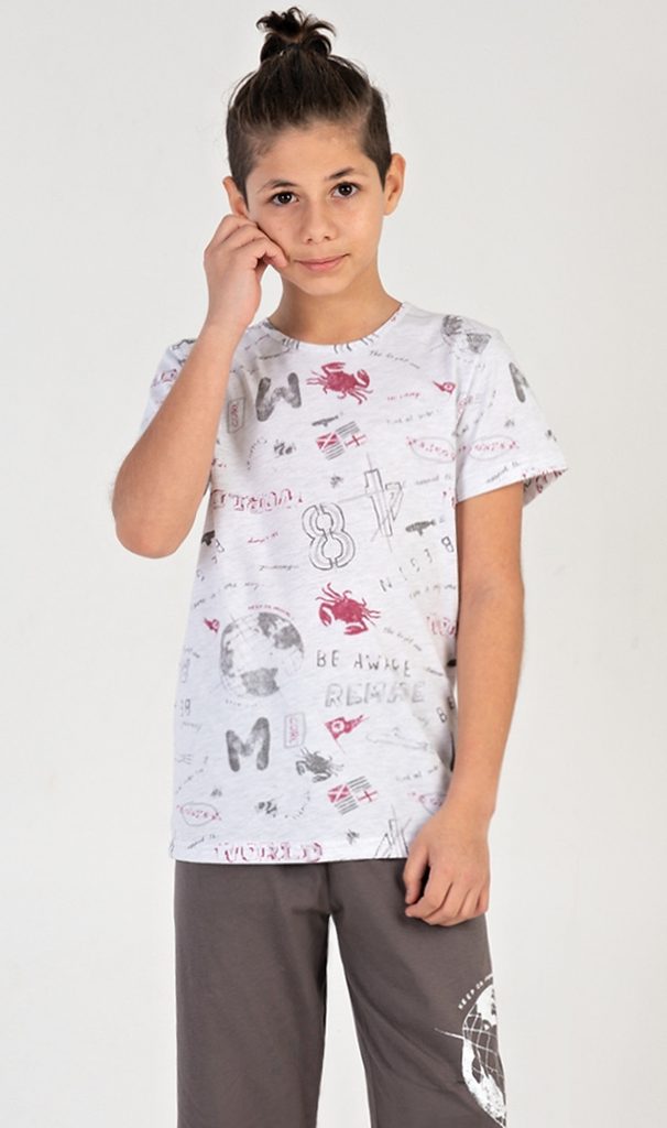 Dětské chlapecké kapri pyžamo Jakub. Dětské pyžamo se skládá z trička s krátkým rukávem a tříčtvrtečních kalhot. Tričko je potištěno motivy moře a cestování. Jednobarevné kapri kalhoty mají v pase gumu, šňůrku na stažení a nemají kapsy. Použitý bavlněný materiál je příjemný a poddajný na dotek. Obsah bavlny u trička je 70% a u kalhot 100%.