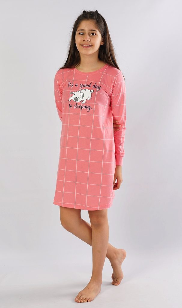 Dětská noční košilka s dlouhým rukávem. Košilka je střižena mírně nad kolena a je vyrobena z kvalitní bavlny, která dětem zajistí maximální pohodlí během spánku i při každodenním nošení. Košile má krásnou azurovou barvu a tenký bílý mřížkovaný vzor. Na hrudi je obrázek spícího pejska s nápisy okolo.