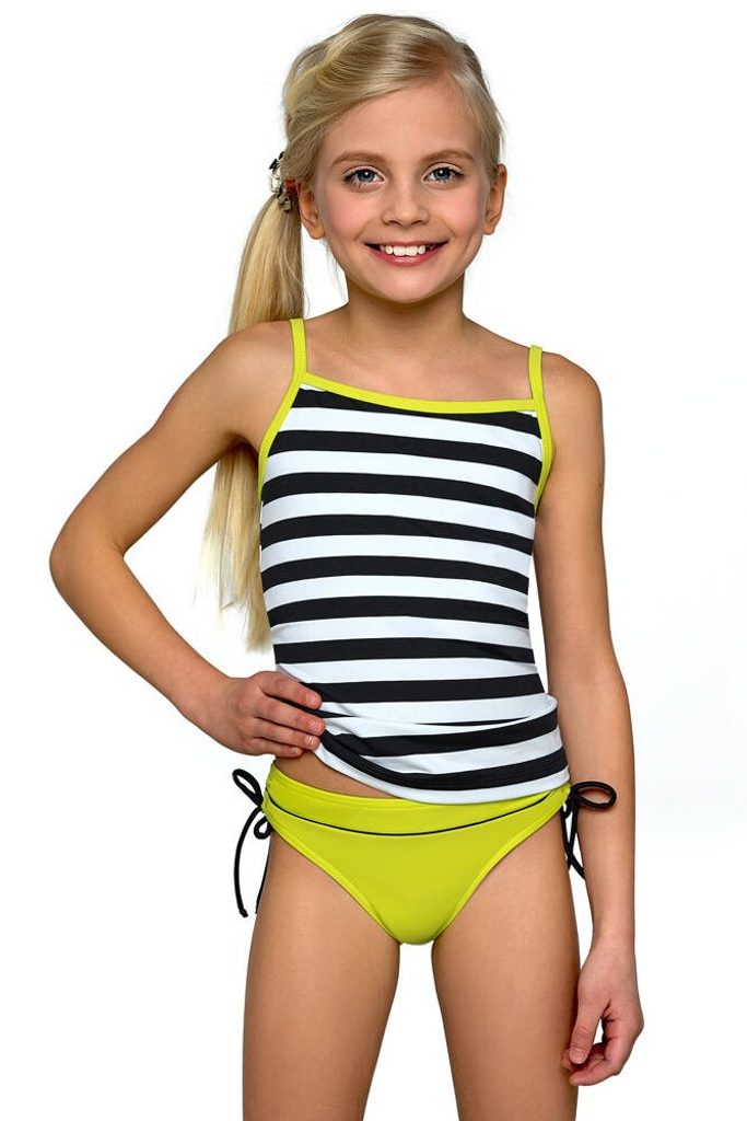 Dětské tankiny s nastavitelnými ramínky a černobílým proužkovaným vzorem.