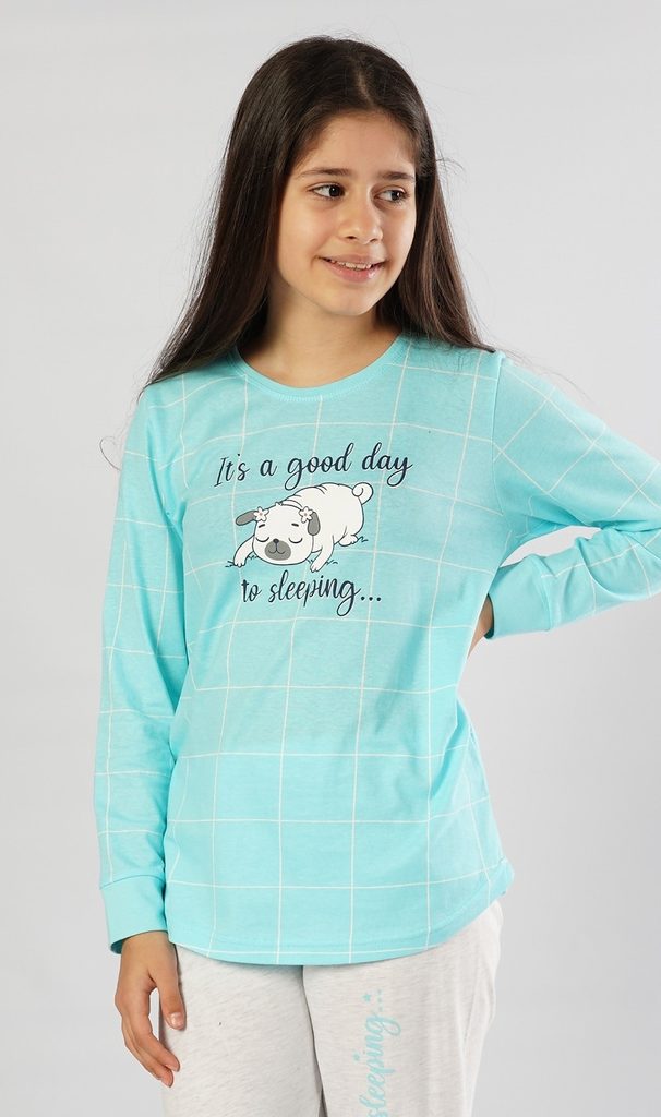 Dětské pyžamo dlouhé Sleeping day. Dětské pyžamo se skládá z trička s dlouhým rukávem a dlouhých nohavic. Na tričku s kostkovaným podkladem je spinkající pejsek, kolem kterého je nápis It´s a good day to sleeping. Stejný motiv se opakuje i na nohavici jednobarevných kalhot, které jsou zakončeny pantem. Použitý materiál je jemný a poddajný na dotek. Pyžamo je vhodné i na denní nošení.