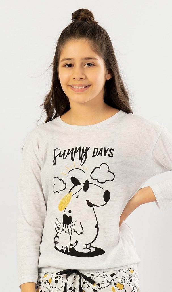 Dětské pyžamo dlouhé Sunny days. Dětské pyžamo se skládá z trička s dlouhým rukávem a dlouhých kalhot. Na tričku mikinového typu je velký obrázek pejska a kočičky slunících se v krásném počasí, nad kterými je nápis Sunny days. Tričko má ve spodní části gumku se šňůrkou na stažení. Motiv pejska a kočičky se opakuje i na dlouhých kalhotách, které jsou zakončeny lemem. Použitý materiál je jemný a poddajný na dotek. Pyžamo je vhodné i na denní nošení.