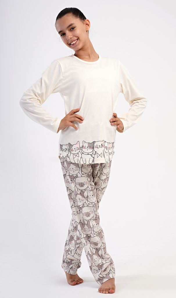 Dětské bavlněné dlouhé pyžamo Koťata. Dívčí pyžamo se skládá z trika s dlouhým rukávem a dlouhých kalhot. Triko s kulatým výstřihem je ozdobeno obrázky koček. Tento motiv se opakuje i na kalhotách, které mají v pase gumu a šňůrku na stažení, nemají kapsy. Použitý bavlněný materiál je poddajný a příjemný na dotek.
