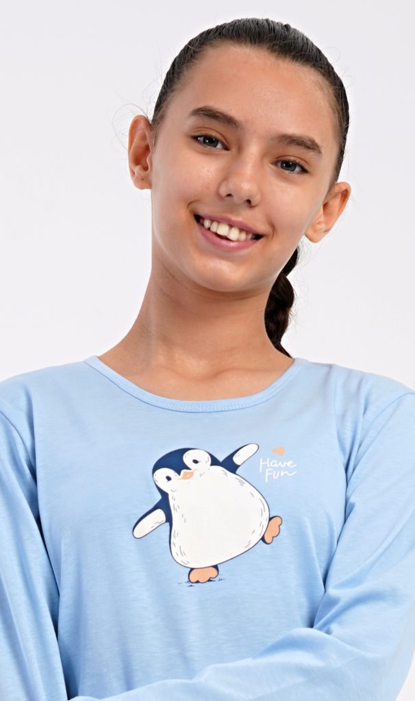 Dětské bavlněné dlouhé pyžamo Tučňák. Dívčí pyžamo se skládá z trika s dlouhým rukávem a dlouhých kalhot. Triko s kulatým výstřihem je ozdobeno obrázkem tučňáka. Tento motiv se opakuje i na kalhotách, které mají v pase gumu a šňůrku na stažení, nemají kapsy. Použitý bavlněný materiál je poddajný a příjemný na dotek.