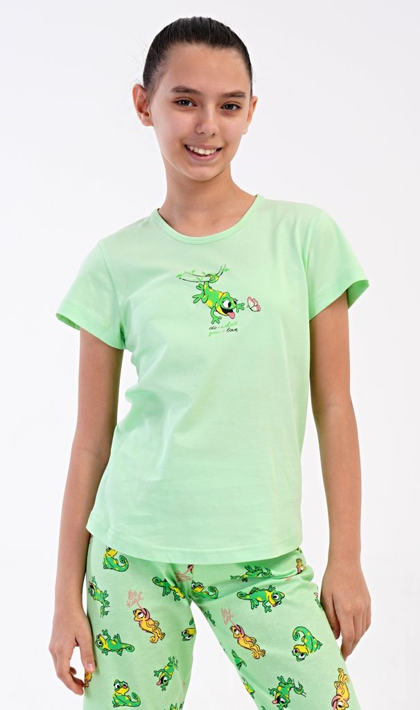 Dětské bavlněné pyžamo kapri Ella. Dětské pyžamo se skládá z trička s krátkým rukávem a tříčtvrtečních kalhot. Na jednobarevném tričku je obrázek veselé ještěrky. Tento motiv se opakuje i na kalhotách, které mají délku pod kolena. Použitý bavlněný materiál je příjemný a poddajný na dotek.