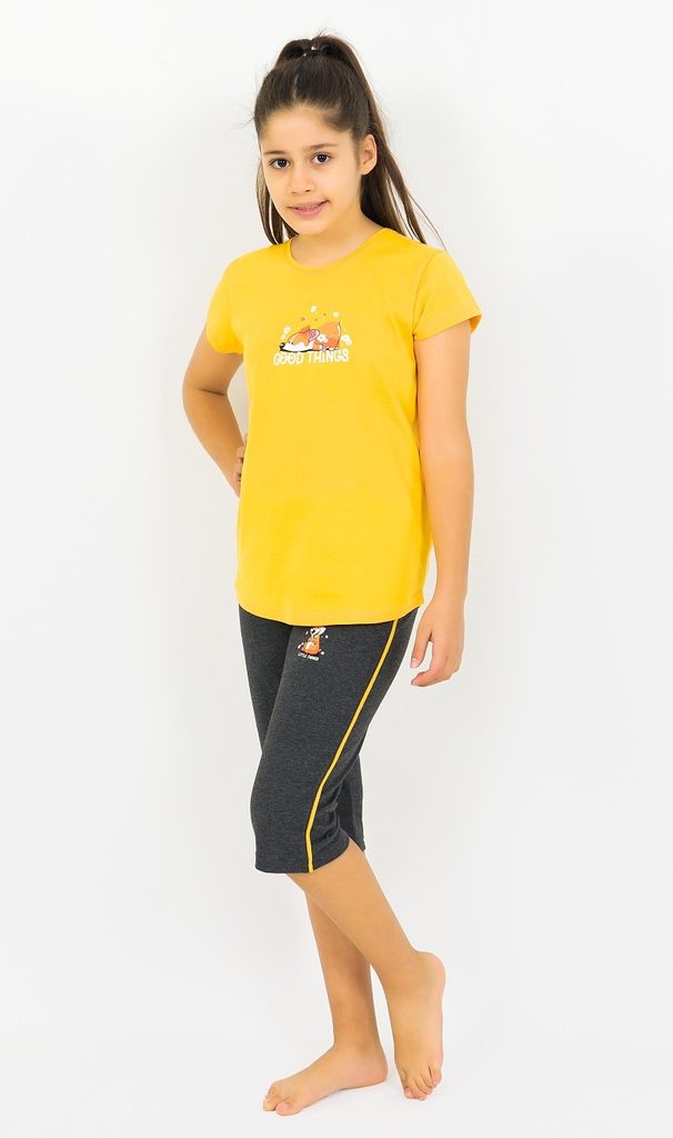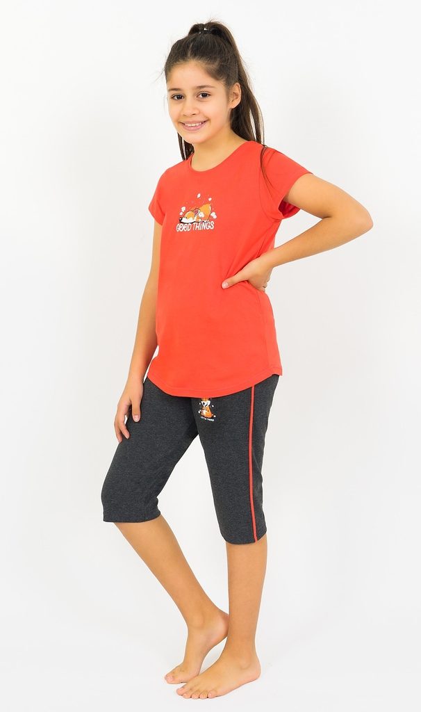 Dětské pyžamo kapri Good things. Dětské pyžamo se skládá z trička s krátkým rukávem a kapri kalhot. Na tričku je roztomilý obrázek odpočívajícího pejska, pod kterým je nápis Good things. Stejný pejsek se opakuje i na kapri kalhotách s pruhem na boku. Použitý materiál je jemný a poddajný na dotek. Pyžamo je vhodné i na denní nošení.