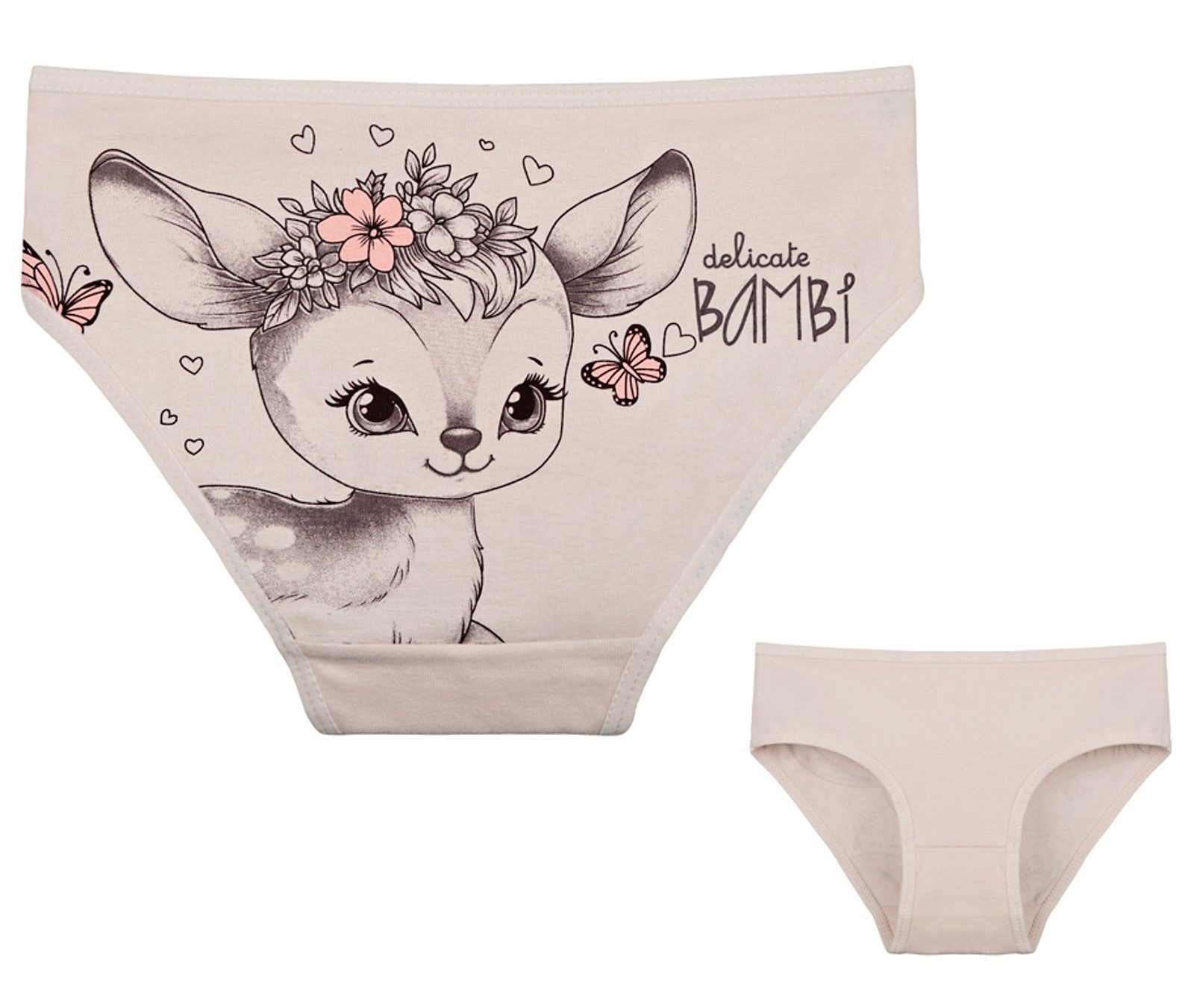 Dětské bavlněné kalhotky Bambi. Dětské kalhotky klasického střihu jsou pohodlné a slušivé, zdobí je obrázek malé srnečky. Obzvláště oceníte materiálové složení - 95% bavlna a 5% elasten. Použitý materiál je příjemný a poddajný na dotek.