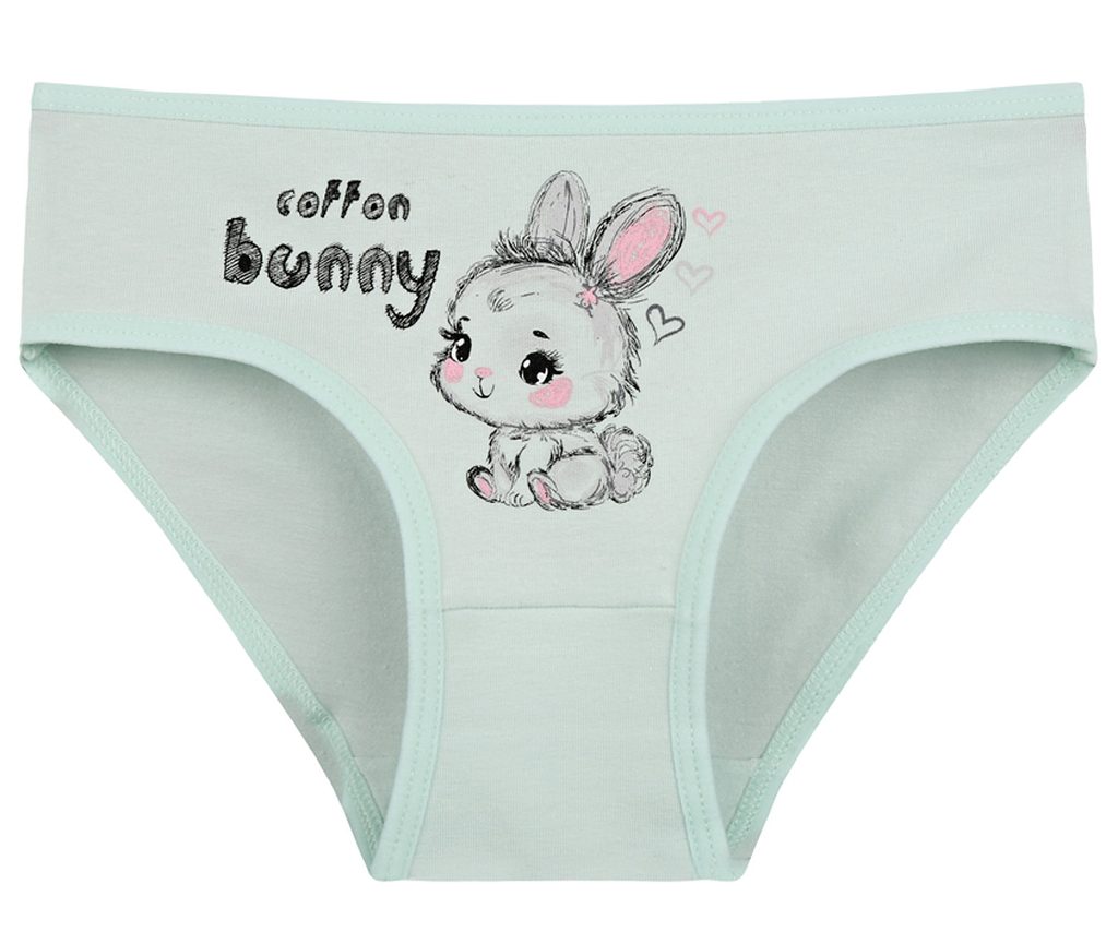 Dětské bavlněné kalhotky Bunny. Dětské kalhotky klasického střihu jsou pohodlné a slušivé, zdobí je obrázek malého králíčka a nápis 'cotton bunny'. Obzvláště oceníte materiálové složení - 95% bavlna a 5% elasten. Použitý materiál je příjemný a poddajný na dotek.