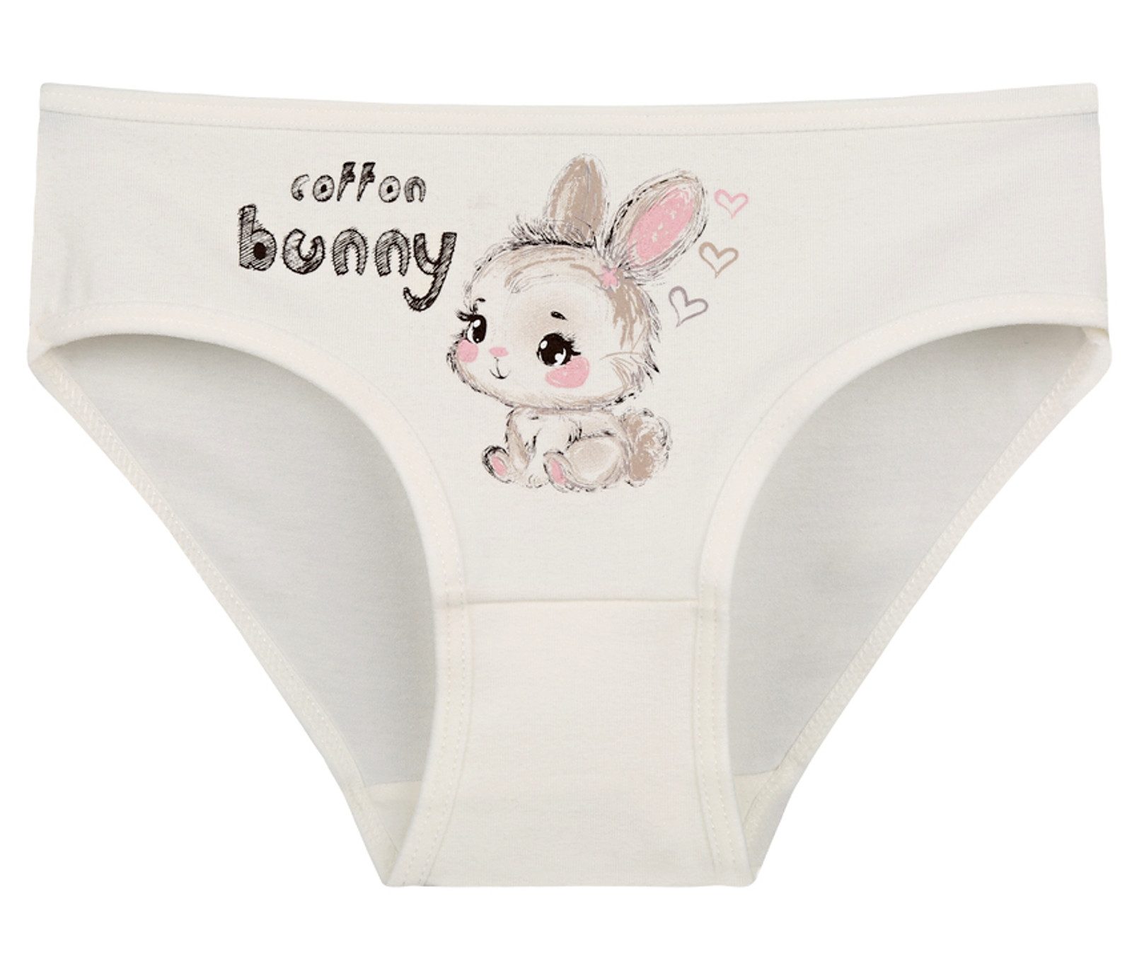 Dětské bavlněné kalhotky Bunny. Dětské kalhotky klasického střihu jsou pohodlné a slušivé, zdobí je obrázek malého králíčka a nápis 'cotton bunny'. Obzvláště oceníte materiálové složení - 95% bavlna a 5% elasten. Použitý materiál je příjemný a poddajný na dotek.