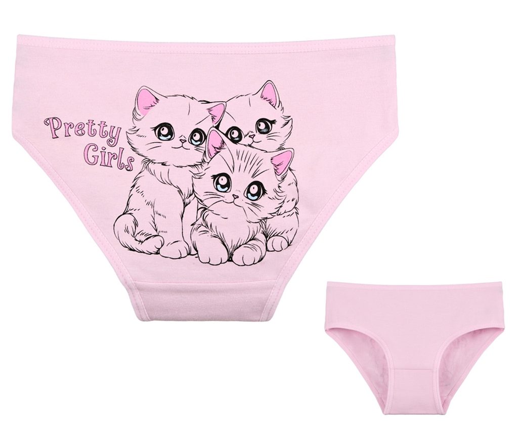 Dětské bavlněné kalhotky Kočička. Dětské kalhotky klasického střihu jsou pohodlné a slušivé, zdobí je obrázek kotěte. Obzvláště oceníte materiálové složení - 95% bavlna a 5% elasten. Použitý materiál je příjemný a poddajný na dotek.