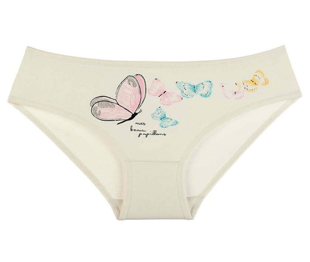 Dětské kalhotky Motýl. Dětské kalhotky klasického střihu s potiskem motýlků na přední straně. Použitý materiál je jemný a poddajný na dotek.