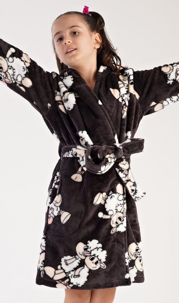 Dětský softový župan s kapucí Ovečka. Dětský župan s kapucí, páskem ke stažení a kapsami je vhodný po koupeli i na povalování se doma na gauči. Na tmavě šedé látce županu jsou natištěné bílé ovečky. Použitý softový materiál je jemný, huňatý a poddajný na dotek.