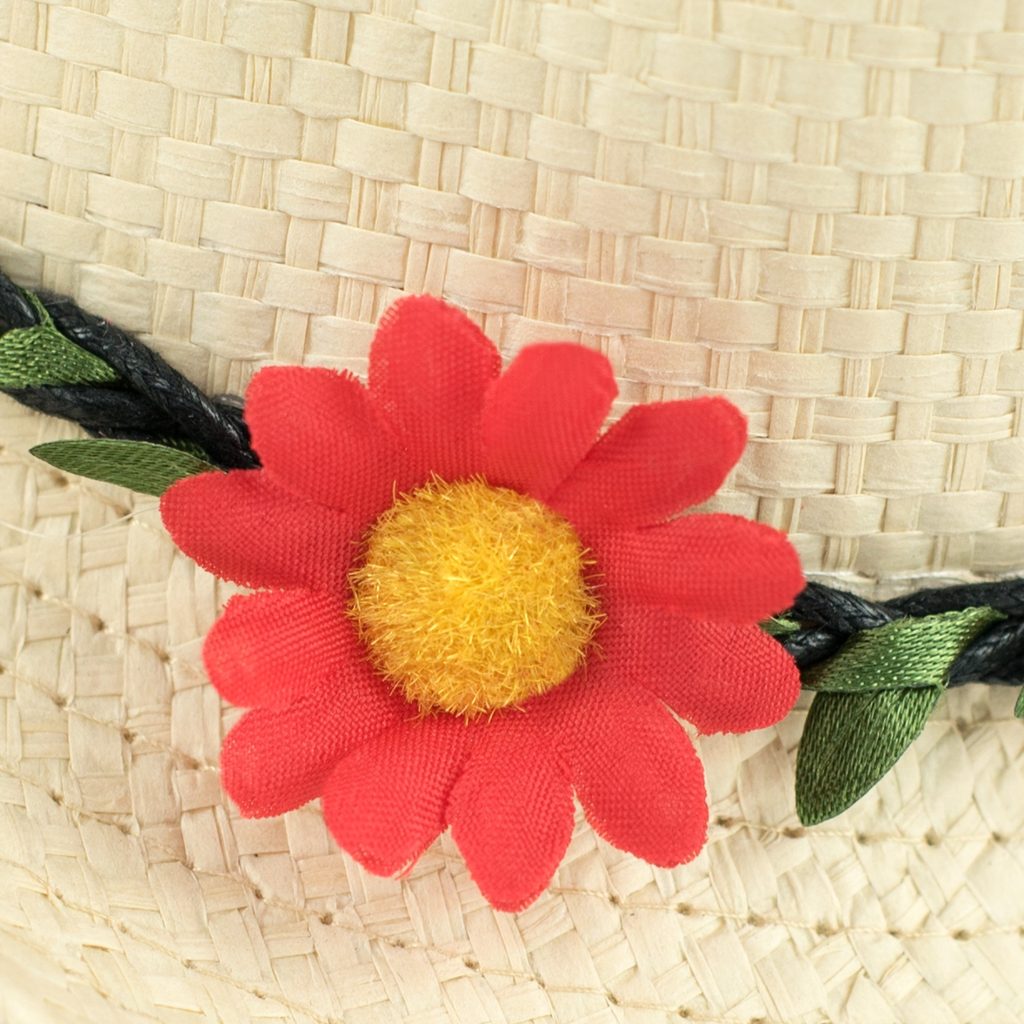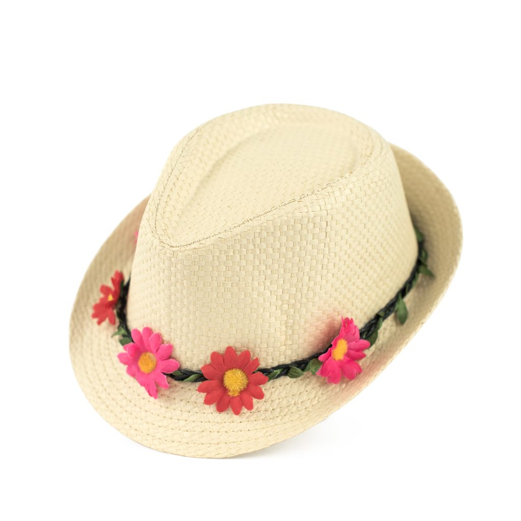 Letní klobouk typu trilby. Výrobek dekorovaný květinou. Provedený z přírodního materiálu. Velmi lehký, hezky se prezentuje na hlavě. Ideální doplněk na horké dny. Roztomilá pokrývka hlavy pro děti.