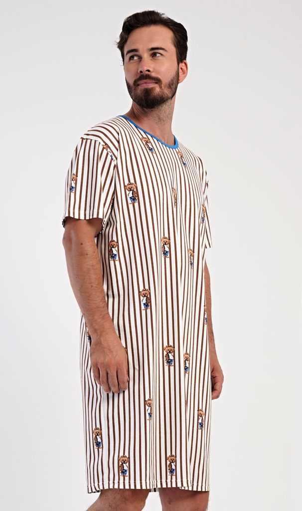 Pánská bavlněná noční košile s krátkým rukávem Bear. Proužkovaná pánská noční košile s kulatým výstřihem a délkou po kolena je potištěna medvídky. Použitý materiál s obsahem bavlny 100% je příjemný a poddajný na dotek.