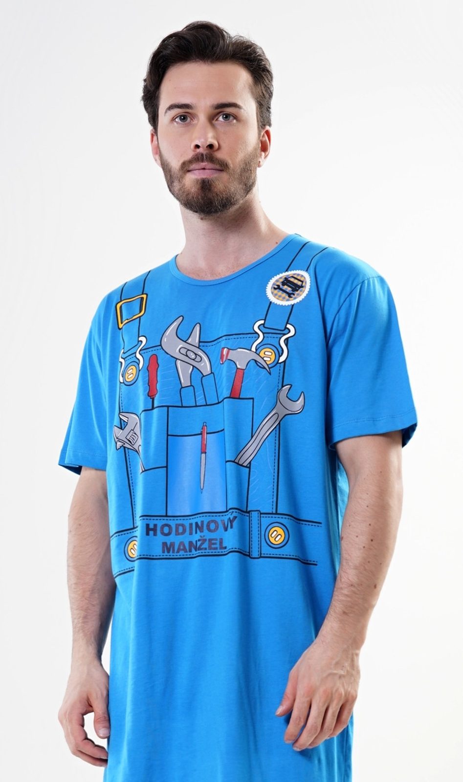 Pánská noční košile s krátkým rukávem Hodinový manžel. Pánská noční košile pro všechny milovníky pohodly s vtipným potiskem imitujícím monterky s nářadím. Použitý materiál je jemný a poddajný na dotek.
