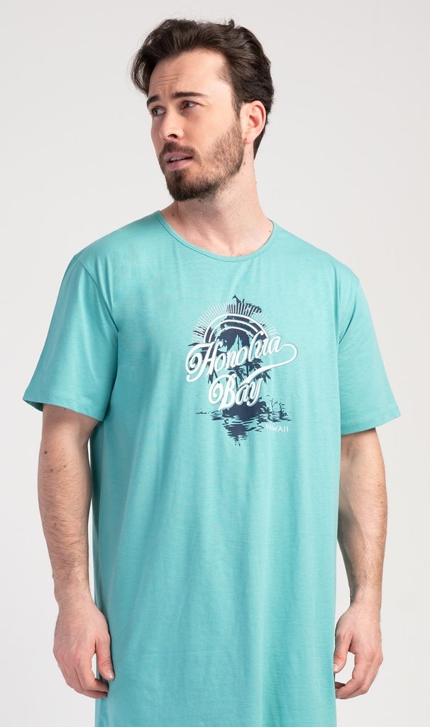 Pánská bavlněná noční košile s krátkým rukávem Honolua bay. Jednobarevná pánská noční košile s kulatým výstřihem je zdobena obrázkem ostrova a nápisem 'Honolua bay'. Tato košile je vhodným dárkem pro všechny milovníky moře a exotiky. Použitý materiál je příjemný a poddajný na dotek. Obsah bavlny je 100%.