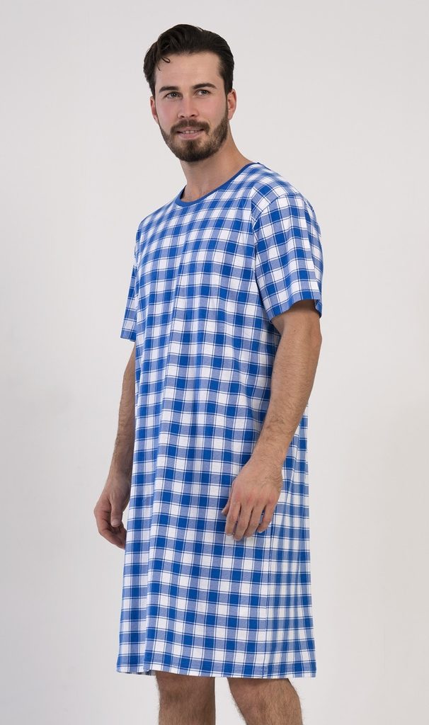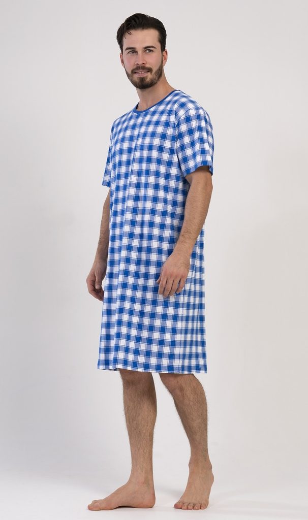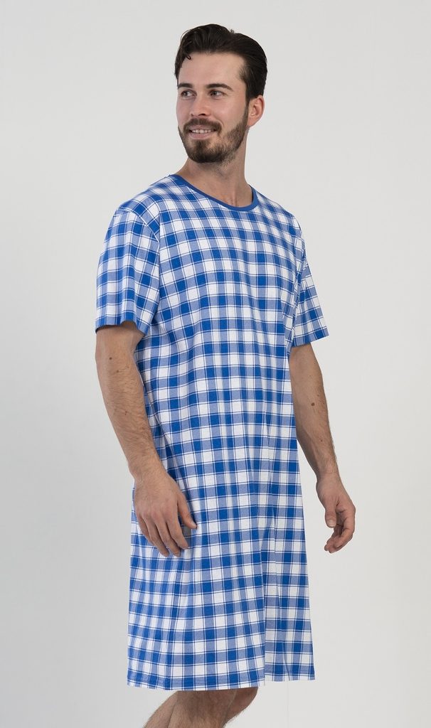 Pánská noční košile s krátkým rukávem Karel. Pánská noční košile s krátkým rukávem pro všechny milovníky pohodlí. Košile je potištěna výrazným kostkovaným motivem. Použitý materiál je jemný a poddajný na dotek. Košile je vhodná na denní nošení.