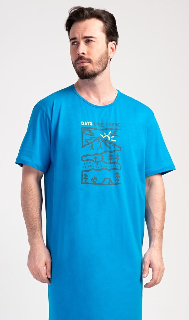Pánská bavlněná noční košile s krátkým rukávem Outdoor. Jednobarevná pánská noční košile s kulatým výstřihem má na hrudi obrázek lesnaté krajiny a nápis 'Days like these'. Tato košile je vhodným dárkem pro všechny milovníky turistiky. Použitý materiál je příjemný a poddajný na dotek. Obsah bavlny je 100%.