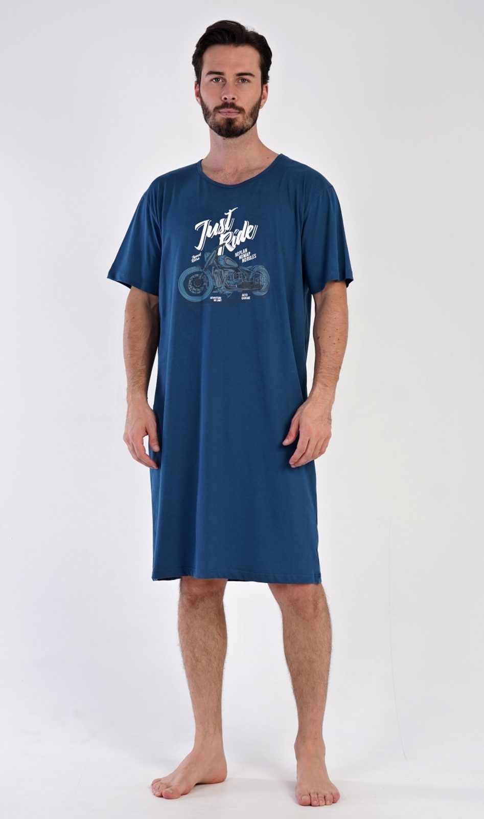 Pánská bavlněná noční košile s krátkým rukávem Samuel. Jednobarevná pánská noční košile s kulatým výstřihem je zdobena větším obrázkem motorky a nápisem JUST RIDE. Tato košile je vhodným dárkem pro všechny milovníky motorek. Použitý materiál je jemný a poddajný na dotek. Obsah bavlny je 100%.