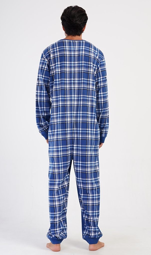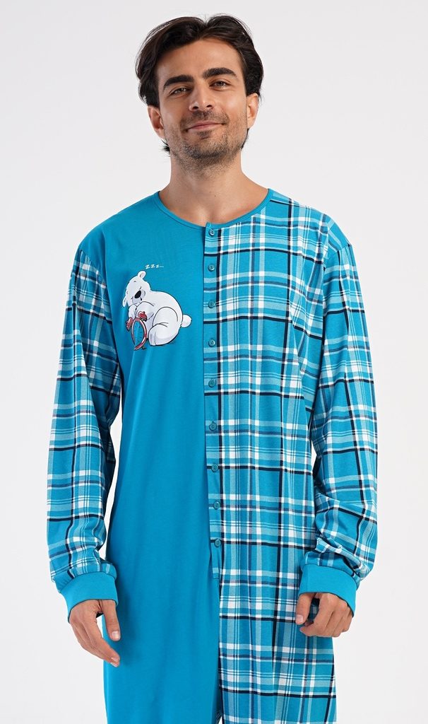 Pánský bavlněný overal Méďa Ospalec. Celopropínací overal zaručuje pohodlné spaní, rukávy a nohavice jsou zakončeny elastickým lemem. Overal se pohledově skládá ze dvou polovin. Jednobarevné, kterou zdobí obrázek ledního medvěda, a kárované, z tohoto materiálu je ušitý i zadní díl a rukávy. Použitý bavlněný materiál je příjemný a poddajný na dotek.