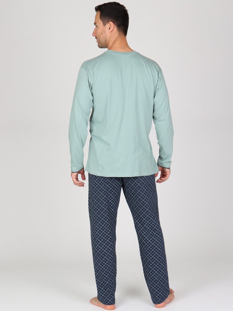 Pohodlné bavlněné pánské dlouhé pyžamo se skládá z jednobarevného trika s dlouhým rukávem a z dlouhých kalhot s károvým potiskem. Triko má na předním díle drobný potisk.