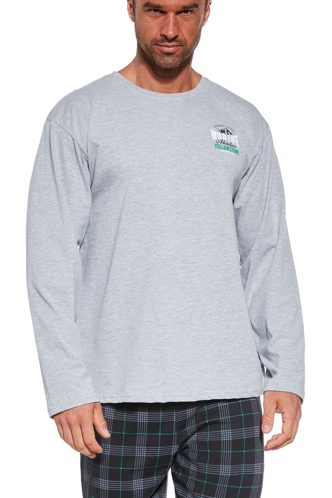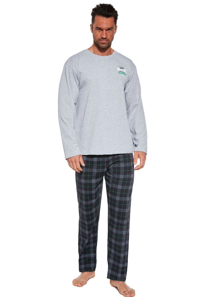 Pánské pyžamo 124/243 Adventure CORNETTE - je vyrobené z velmi kvalitní bavlny - šedé tričko s dlouhými rukávy - ozdobené potiskem - pohodlné kárované dlouhé kalhoty
