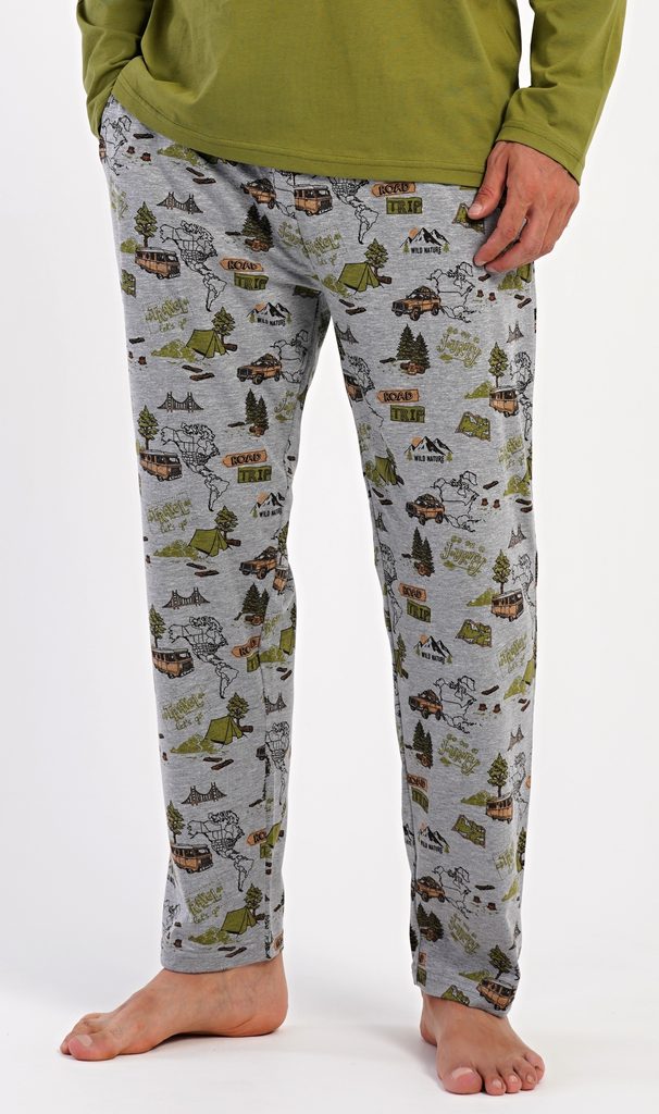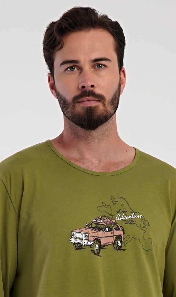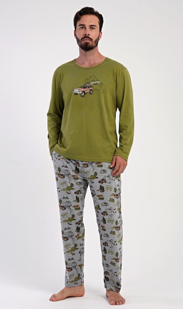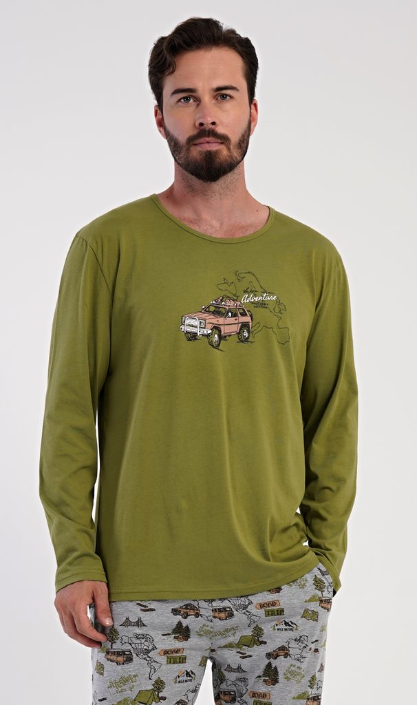 Pánské dlouhé pyžamo Adventure. Pánské pyžamo se skládá z trika s dlouhým rukávem a dlouhých kalhot. Triko je jednobarevné, zdobené na hrudi obrázkem terénního auta. Kalhoty mají v pase gumu, šňůrku na stažení a praktické kapsy. Použitý materiál je příjemný a poddaný na dotek. Obsah bavlny u trika je 100% a u kalhot 70%.