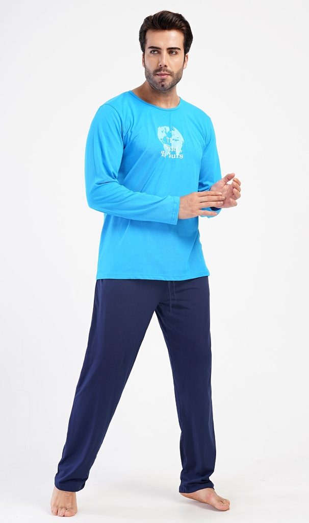 Pánské dlouhé bavlněné pyžamo Matěj. Pánské pyžamo se skládá z trika s dlouhým rukávem a dlouhých kalhot. Triko s kulatým výstřihem je jednobarevné, zdobené na hrudi obrázkem zeměkoule a nápisem 'The world is yours'. Jednobarevné kalhoty mají v pase gumu, šňůrku na stažení a praktické kapsy. Použitý materiál je poddajný a příjemný na dotek. Obsah bavlny u kalhot a modrého trika je 100%, pouze u šedého trika 70%.