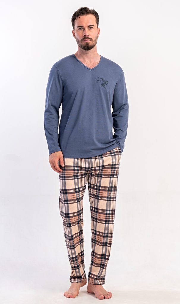 Pánské dlouhé bavlněné pyžamo Paul. Pánské pyžamo se skládá z trika s dlouhým rukávem a dlouhých kalhot. Triko je jednobarevné, zdobené na hrudi drobným obrázkem. Kostkované kalhoty mají v pase gumu, šňůrku na stažení a praktické kapsy. Použitý materiál s obsahem bavlny 100% je poddajný a příjemný na dotek.