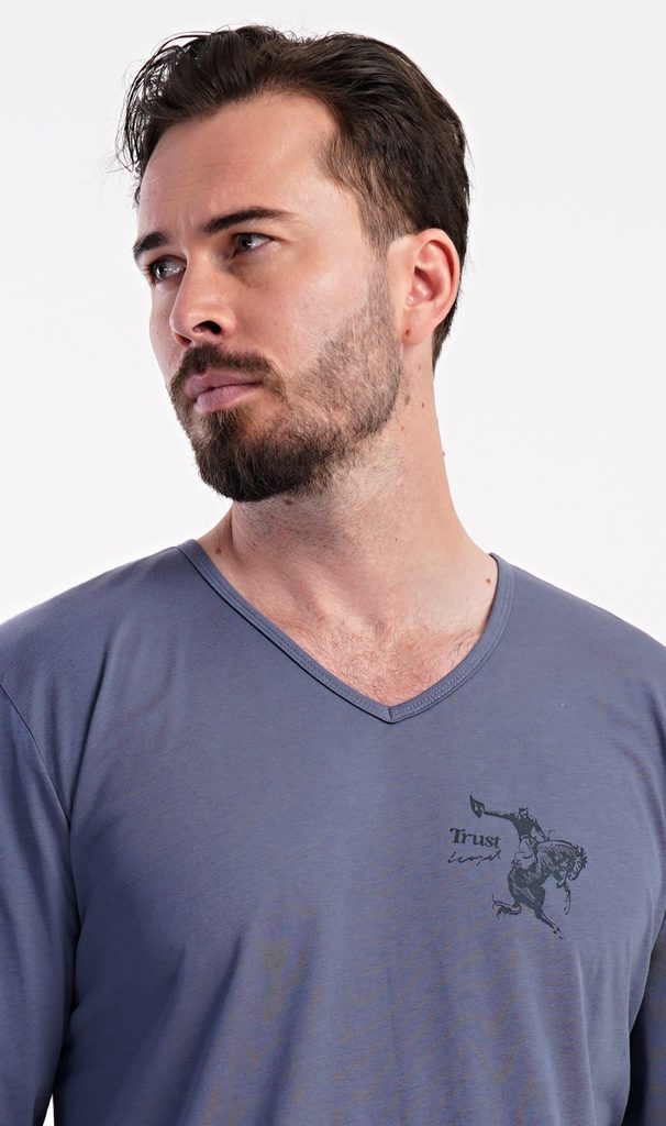 Pánské dlouhé bavlněné pyžamo Paul. Pánské pyžamo se skládá z trika s dlouhým rukávem a dlouhých kalhot. Triko je jednobarevné, zdobené na hrudi drobným obrázkem. Kostkované kalhoty mají v pase gumu, šňůrku na stažení a praktické kapsy. Použitý materiál s obsahem bavlny 100% je poddajný a příjemný na dotek.
