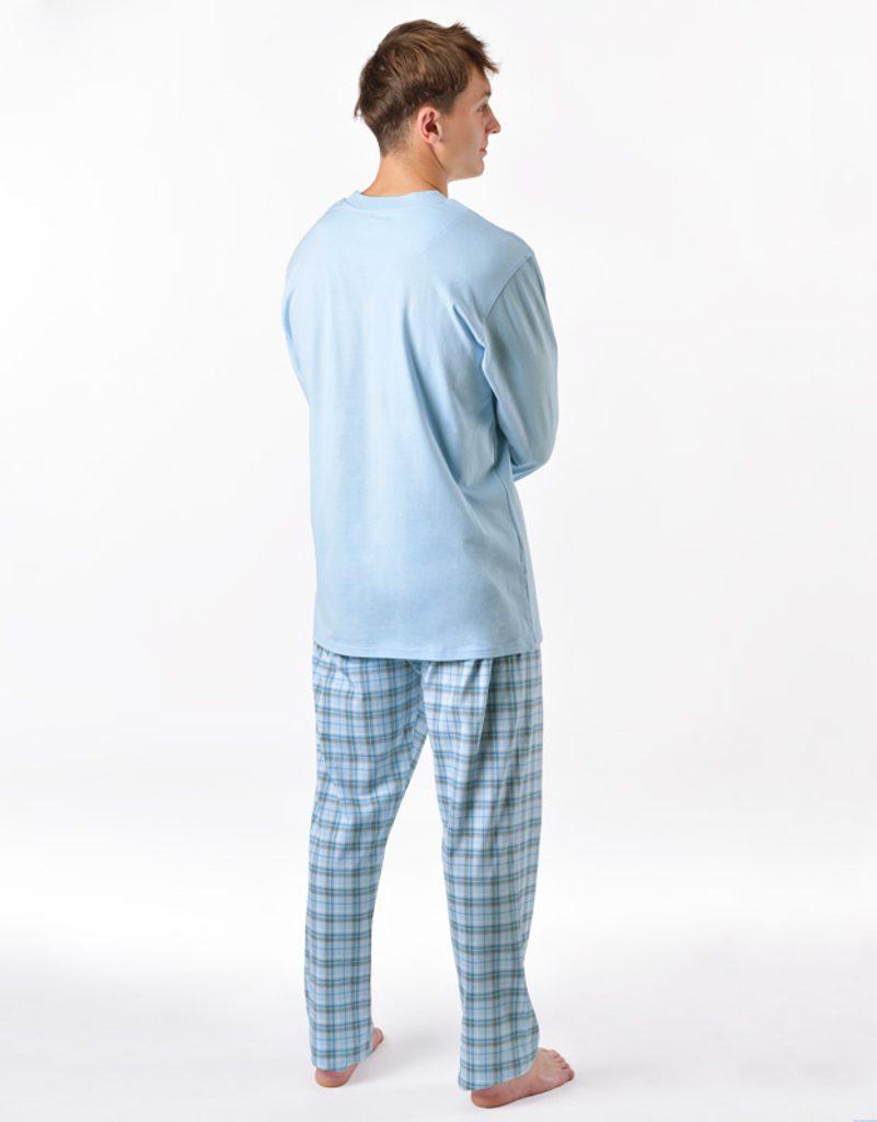 Pánské klasické pyžamo volného střihu z jemného úpletu Vám poskytne pohodlí během spánku. Kalhoty s oblíbeným vzorem káro doplňuje jednobarevné triko s dlouhými rukávy.