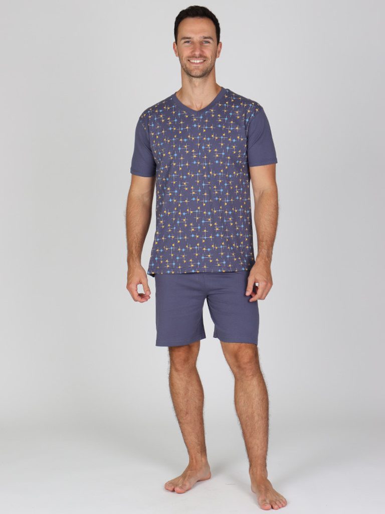 Pohodlné bavlněné pánské krátké pyžamo se skládá z trika s celoplošným potiskem a krátkých jednobarevných kalhot.