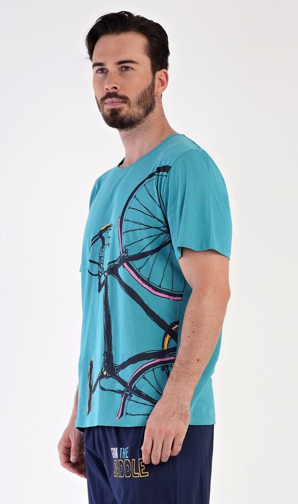 Pánské bavlněné pyžamo bermudy Dominik. Pánské pyžamo se skládá z trička s krátkým rukávem a kalhot po kolena. Jednobarevné triko zdobí výrazný obrázek kola. Kalhoty mají v pase gumu, šňůrku na stažení a praktické kapsy. Použitý materiál je jemný a poddajný na dotek. Podíl bavlny u trika a kalhot je 100%.