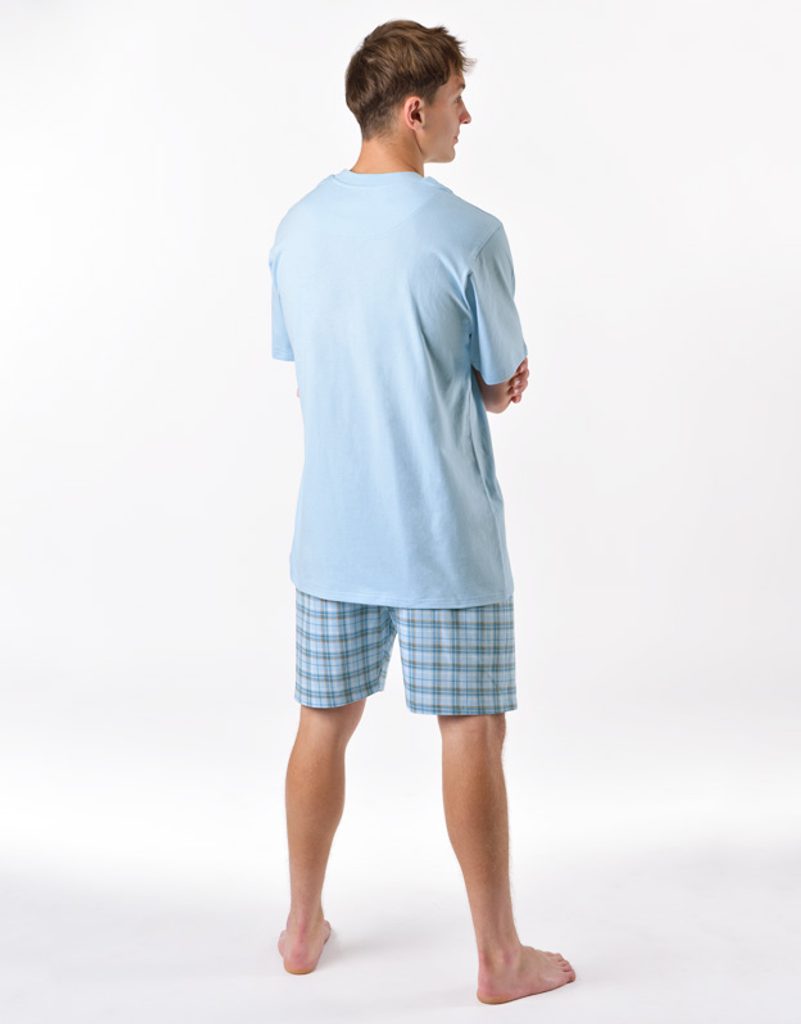 Pánské pyžamo volného střihu z jemného úpletu Vám poskytne pohodlí během spánku. Krátké kalhoty s oblíbeným vzorem káro doplňuje triko s krátkými rukávy.