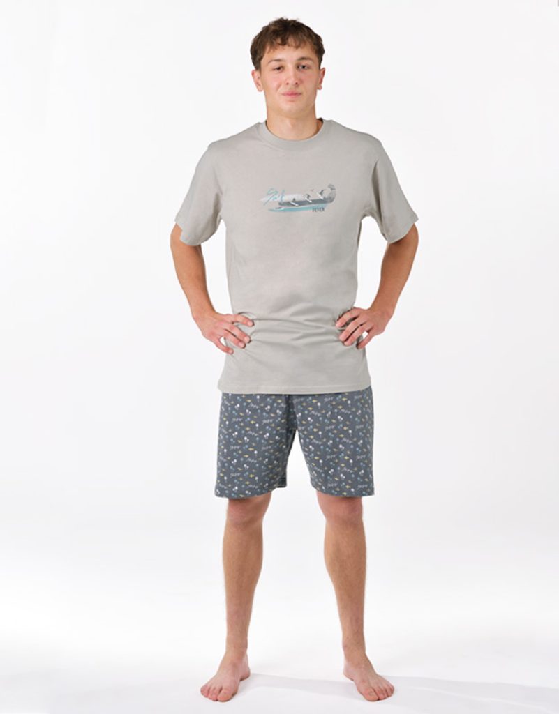Pánské pyžamo volného střihu z jemného úpletu Vám poskytne pohodlí během spánku. Krátké kalhoty jsou potištěny drobným vzorem, triko s krátkými rukávy zdobí větší potisk na hrudi.