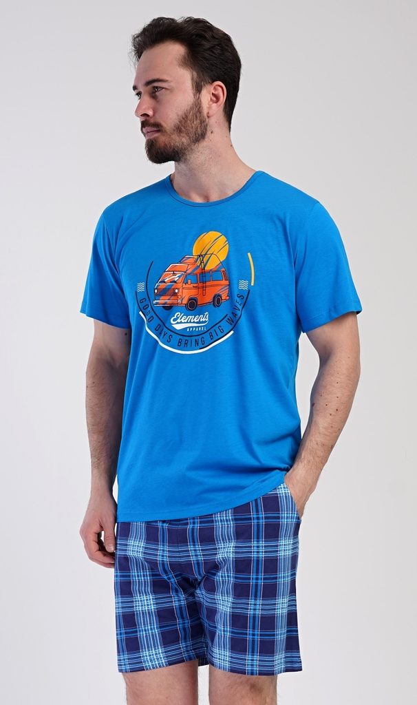 Pánské bavlněné šortkové pyžamo Adventure. Pánské pyžamo se skládá z trička s krátkým rukávem a krátkých šortkových kalhot. Na tričku je obrázek obytného vozu a nápis 'Good days bring big waves'. Tričko doplňují kárované šortky, které mají v pase gumu, šňůrku na stažení a praktické kapsy. Použitý materiál s obsahem bavlny 100% je příjemný a poddajný na dotek.