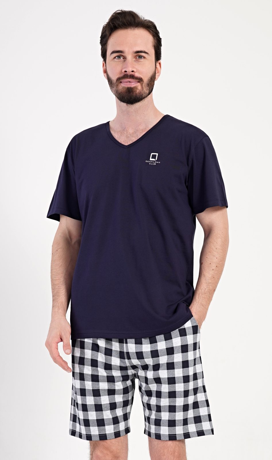 Pánské bavlněné šortkové pyžamo Alfréd. Pánské pyžamo se skládá z trička s krátkým rukávem a krátkých šortkových kalhot. Tričko s výstřihem do V zdobí na hrudi malé logo a nápis GENTLEMAN CLUB. Tričko doplňují kárované šortky, které mají v pase gumu, šňůrku na stažení a praktické kapsy. Použitý materiál s obsahem bavlny 100% je příjemný a poddajný na dotek.