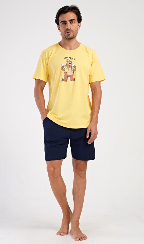 Pánské bavlněné šortkové pyžamo Beer always. Pánské pyžamo se skládá z trička s krátkým rukávem a krátkých šortkových kalhot. Na jednobarevném tričku je obrázek medvěda s pivem a nápis 'Beer always'. Šortky mají praktické kapsy, v pase gumu a šňůrku na stáhnutí. Použitý materiál s podílem bavlny 100% je příjemný a poddaný na dotek. Pyžamo oceníte obzvlášť v horkých letních dnech.