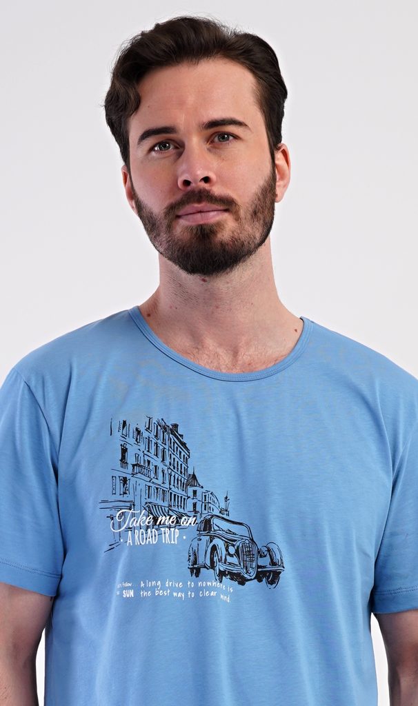 Pánské bavlněné šortkové pyžamo Felix. Pánské pyžamo se skládá z trička s krátkým rukávem a krátkých šortkových kalhot. Tričko s kulatým výstřihem zdobí na hrudi obrázek historického auta. Tričko doplňují kárované šortky, které mají v pase gumu, šňůrku na stažení a praktické kapsy. Použitý materiál s obsahem bavlny 100% je příjemný a poddajný na dotek.