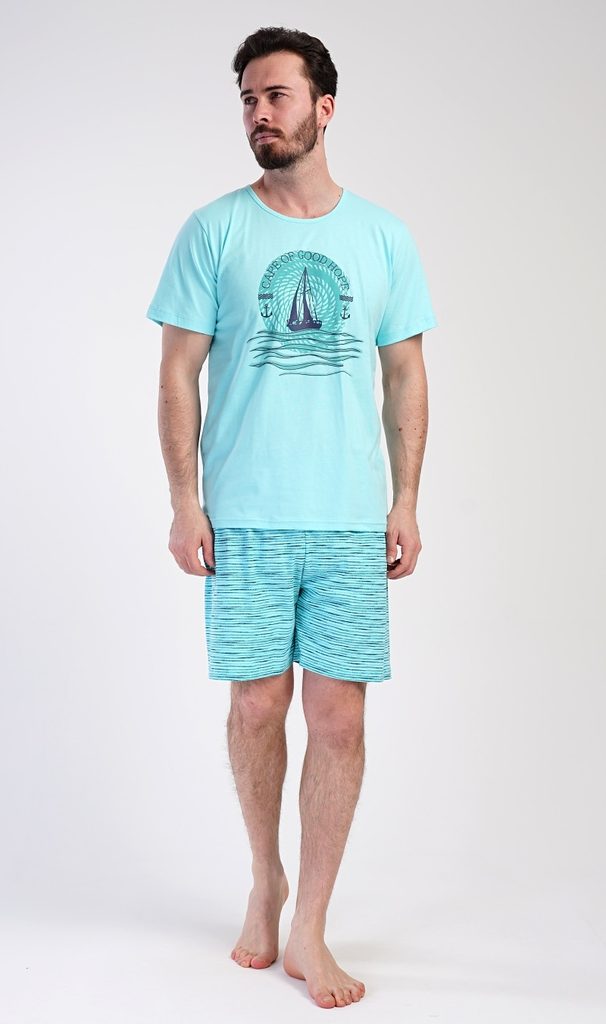 Pánské bavlněné šortkové pyžamo Jachting. Pánské pyžamo se skládá z trička s krátkým rukávem a krátkých šortkových kalhot. Jednobarevné tričko s kulatým výstřihem má na hrudi obrázek plachetnice a nápis 'Cape of good hope'. Tričko doplňují šortky s potiskem zvlněných proužků, které mají v pase gumu a šňůrku na stažení, nemají kapsy. Použitý materiál s obsahem bavlny 100% je příjemný a poddajný na dotek.
