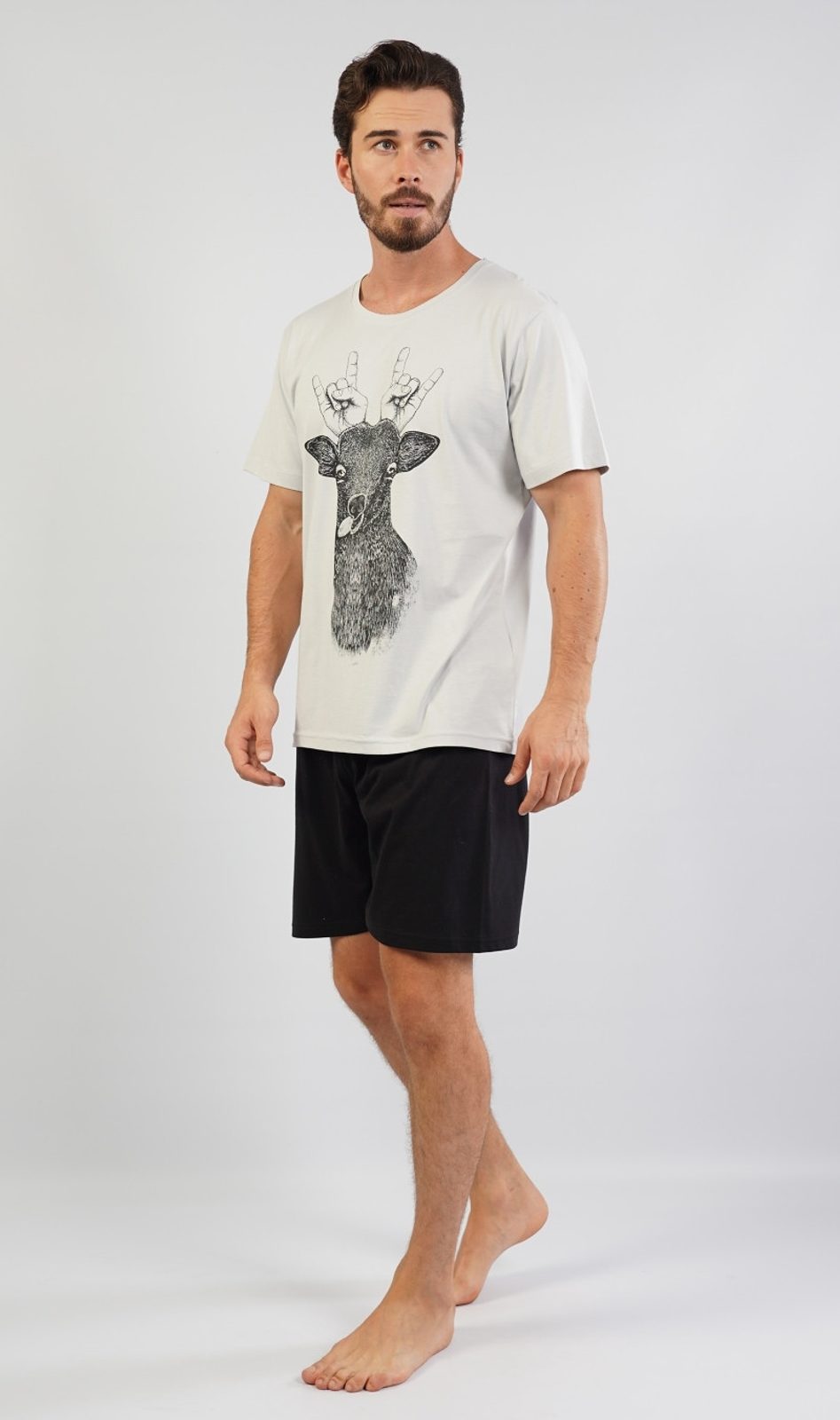 Pánské pyžamo Jelen. Pánské pyžamo se skládá z trička s krátkým rukávem a šortek. Světle šedé tričko má na přední straně vtipný obrázek jelena s rukama místo paroží. Tričko je doplněné tmavými jednobarevnými šortkami. Pyžamo je vyrobené z jemného materiálu, který je poddajný na dotek.