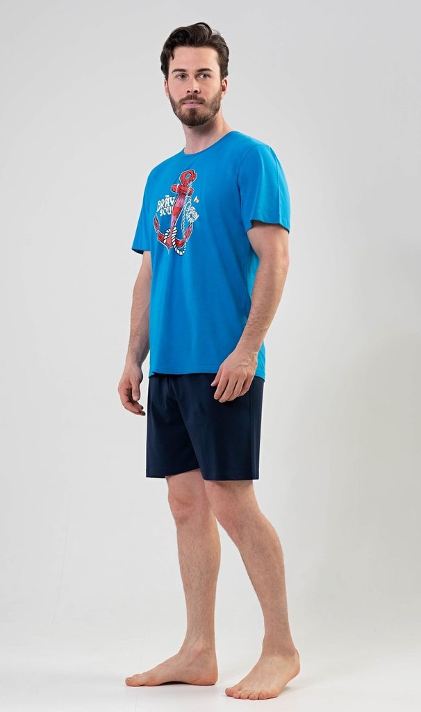 Pánské pyžamo Kotva. Pánské pyžamo se skládá z basic trička s krátkým rukávem a krátkých šortek. Modré tričko má na přední straně vytisknutý obrázek kotvy. Šortky jsou jednobarevné. Materiál je pohodlný a příjemný na dotek.
