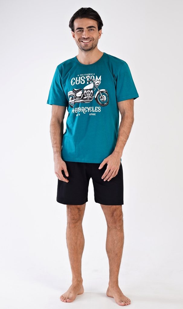 Pánské bavlněné pyžamo šortky Motocykl. Pánské pyžamo se skládá z trička s krátkým rukávem a krátkých šortkových kalhot. Na jednobarevném tričku s kulatým výstřihem je nápis 'California custom motocycles' a obrázek motorky. Tričko doplňují jednobarevné šortky, které mají v pase gumu a šňůrku ke stažení. Nemají kapsy. Použitý materiál je příjemný a poddajný na dotek. Podíl bavlny u trička a šortek je 100%. Pyžamo je vhodné i na denní nošení.