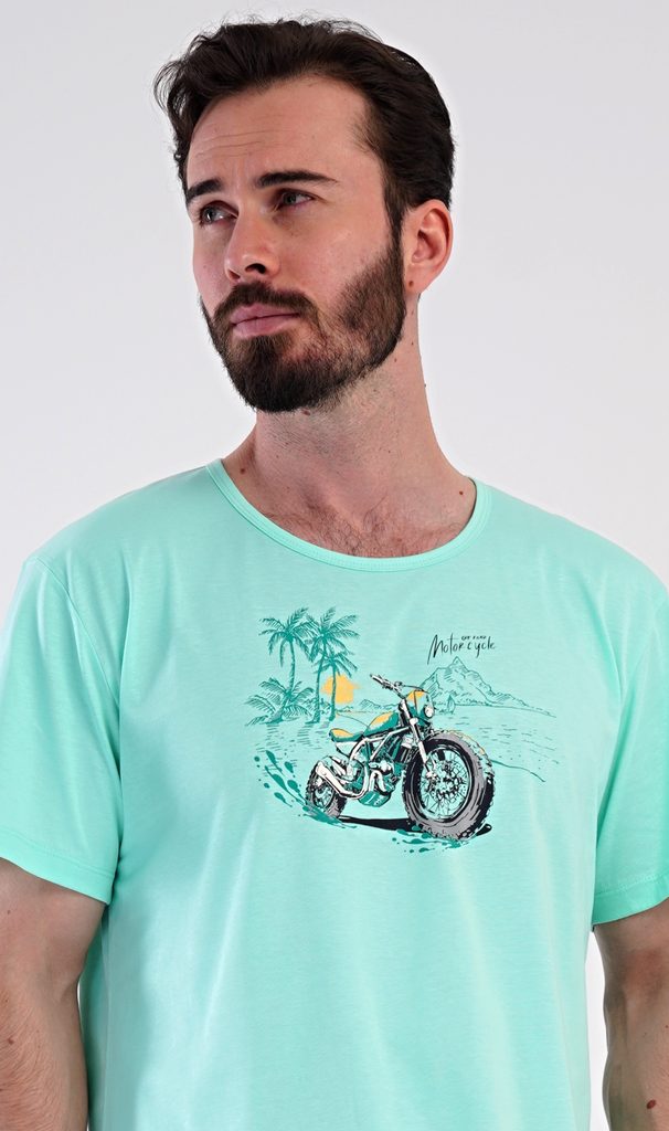 Pánské bavlněné šortkové pyžamo Pavel. Pánské pyžamo se skládá z trička s krátkým rukávem a krátkých šortkových kalhot. Na jednobarevném tričku je obrázek terénní motorky. Šortky mají praktické kapsy, v pase gumu a šňůrku na stáhnutí. Použitý materiál s podílem bavlny 100% je příjemný a poddaný na dotek. Pyžamo je vhodné i na denní nošení a oceníte ho obzvlášť v horkých letních dnech.