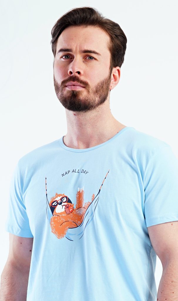 Pánské šortkové pyžamo Pohodář. Pánské pyžamo se skládá z trička s krátkým rukávem a krátkých šortkových kalhot. Na tričku je obrázek lenochoda v houpací síti. Šortky mají kapsy, v pase gumu a šňůrku na stáhnutí. Použitý materiál je příjemný a poddaný na dotek. Obsah bavlny u trička je 100% a u šortek 70%. Pyžamo je vhodné i na denní nošení a oceníte ho obzvlášť v horkých letních dnech.