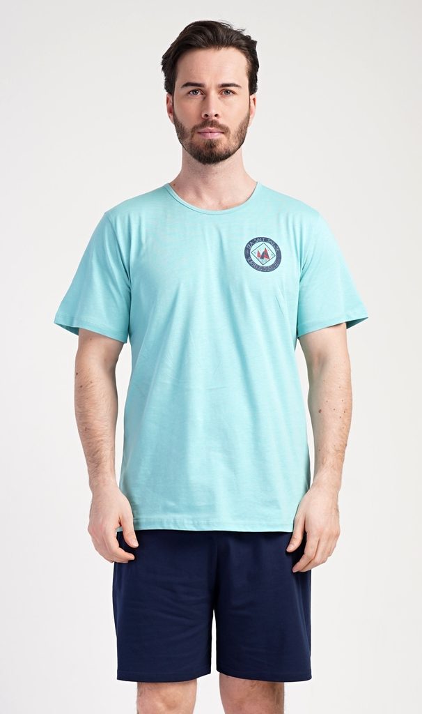 Pánské bavlněné pyžamo šortky Sea. Pánské pyžamo se skládá z trička s kulatým výstřihem a krátkých šortkových kalhot. Tričko s krátkým rukávem má na hrudi decentní obrázek s námořnickým motivem. Doplňují jej jednobarevé krátké kalhoty, které mají v pase gumu a šňůrku na stažení, nemají kapsy. Použitý bavlněný materiál je příjemný a poddajný na dotek. Pyžamo je vhodné i na denní nošení.