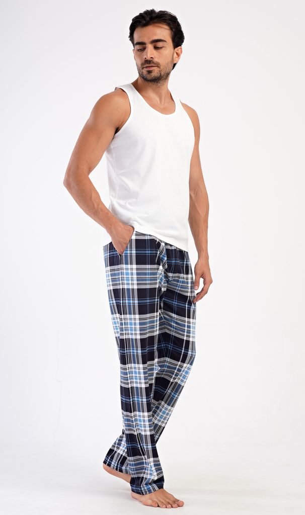 Pánské bavlněné pyžamové kalhoty Bruno. Kostkované kalhoty mají v pase gumu, šňůrku na stažení a praktické kapsy. Mateiriál s podílem bavlny 100% je příjemný a poddajný na dotek.