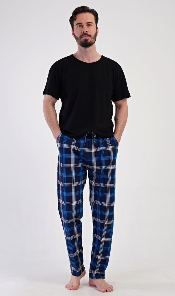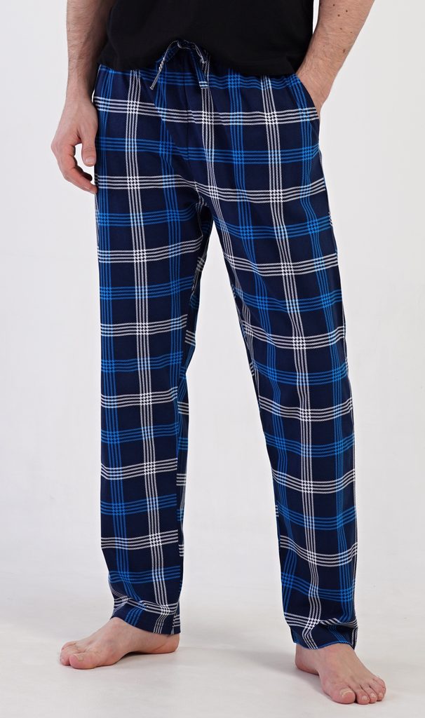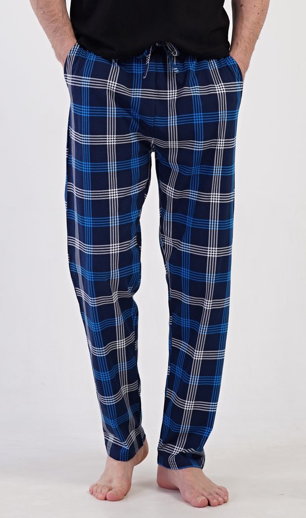 Pánské bavlněné pyžamové kalhoty Matěj. Kostkované kalhoty mají v pase gumu, šňůrku na stažení a praktické kapsy. Mateiriál s podílem bavlny 100% je příjemný a poddajný na dotek.