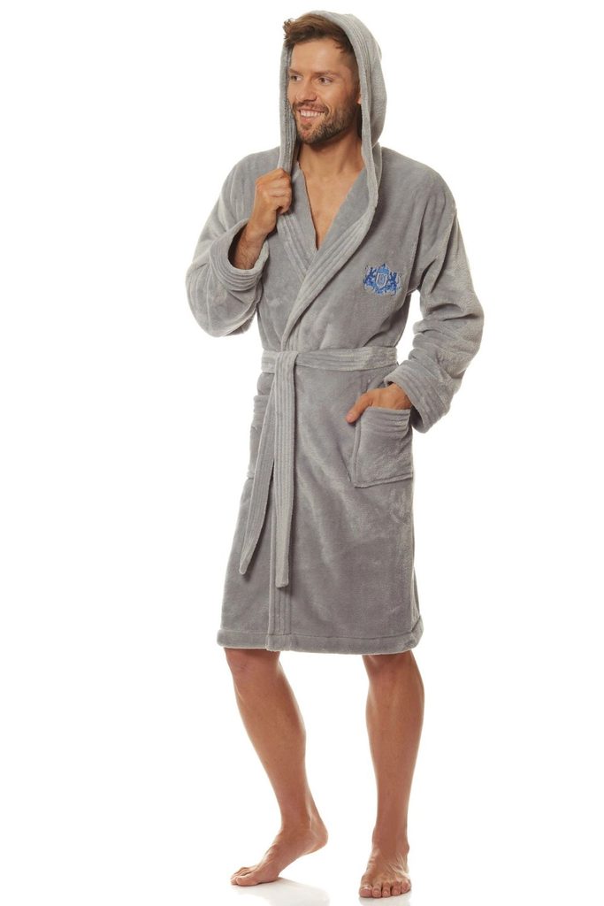 Pánský župan klasického střihu 2110 Costa L&L - z měkké tkaniny velmi příjemné na dotyk - na hrudi má malou nášivku - zavazuje se v pase páskem - na bocích našité kapsy - s kapucí - délka do poloviny stehen